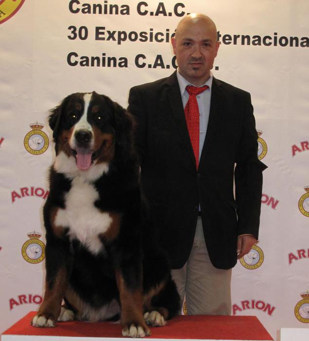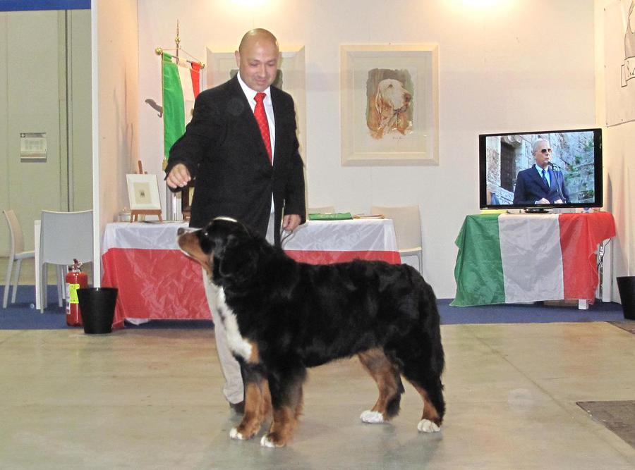 "Strong and compact female, correct bite, good dark eyes, excellent lips, could have a bit more neck, excellent bone, good body, a bit soft top line, excellent tail set, enought forechest, move with excellent drive, a bit loose in elbows, good coat, excellent tan coloor, nice temperament"
